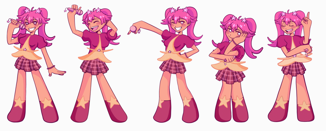 These animated sprites correspond to each key the player presses during the level. From left to right, they are the idle, A, S, D, and F animations. They were drawn in Procreate and animated in Adobe After Effects.